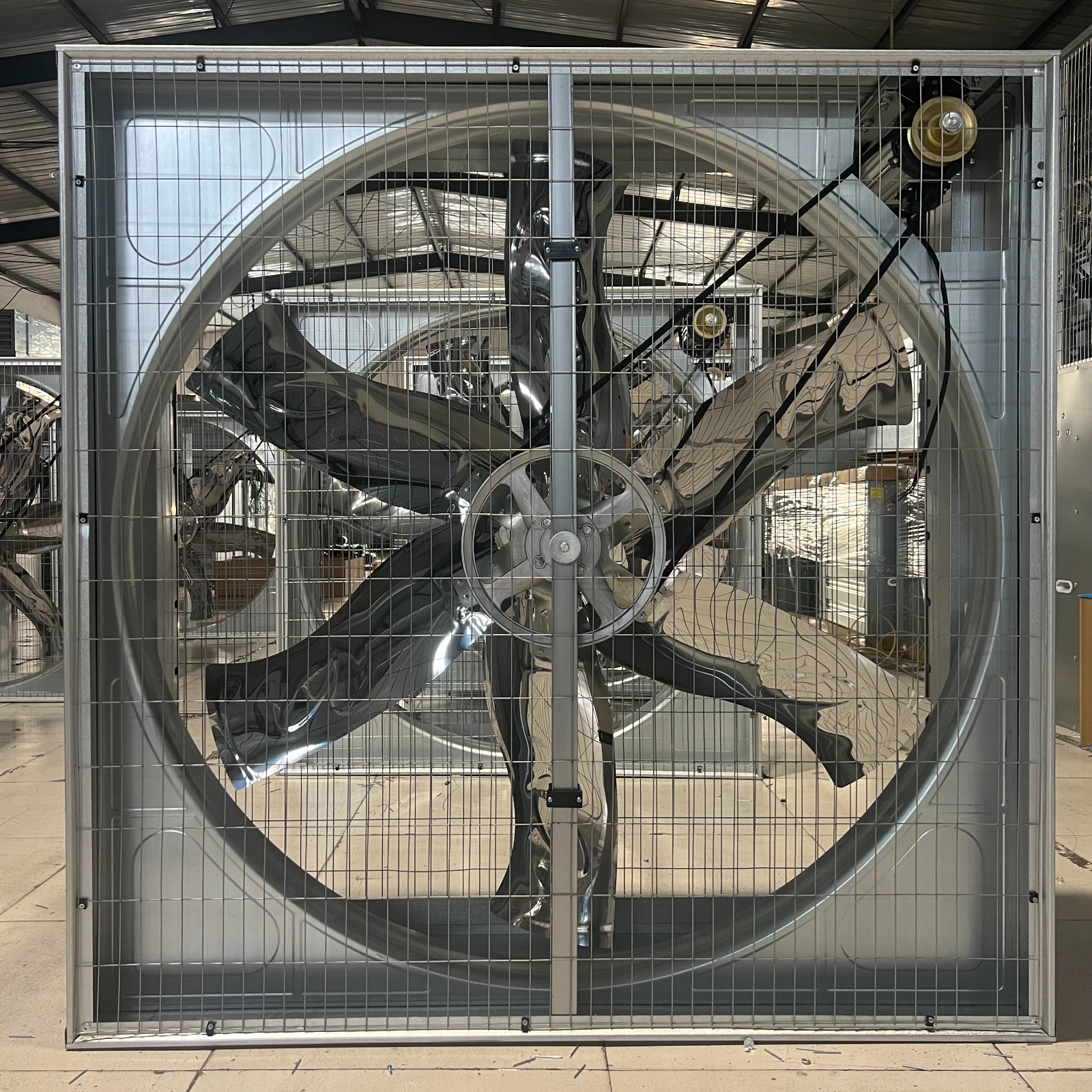 Лопасти, двигатель, рама, защитная сетка и распорный каркас. Двигатель приводит в движение лопасти, создавая воздушный поток.- Материал лопастей самоочищающаяся нержавеющая сталь. Не деформируется, не пылит. Способен пропускать большие потоки воздуха.